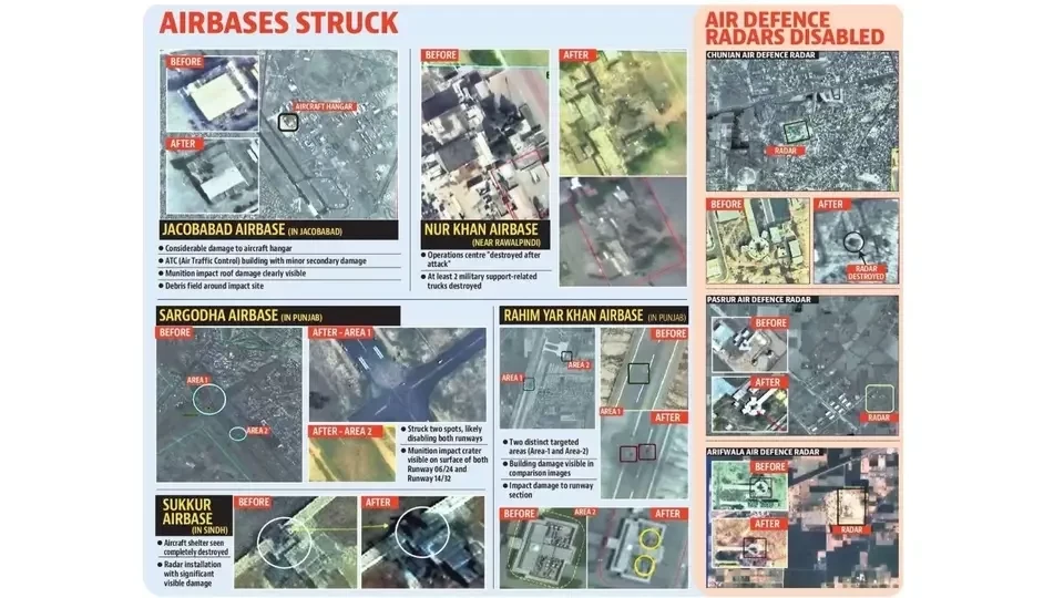 Спутниковые снимки, опубликованные министерством обороны Индии и коммерческими операторами, подтвердили серию точных ударов по восьми ключевым авиабазам Пакистана. Операция была проведена 10 мая, незадолго до достижения сторонами договорённости о прекращении боевых действий, пишет Hindustan Times.
