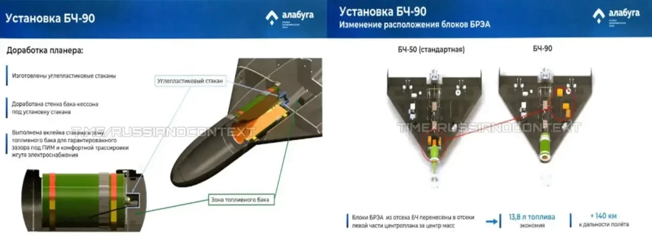 Разработка таких БЧ «с нуля» потребует времени, однако можно рассмотреть возможность использования в качестве БЧ для наших БПЛА-камикадзе мин осколочных направленных серии МОН, а именно МОН-200 для БПЛА-камикадзе «Герань-М» и МОН-90 для БПЛА-камикадзе «Гербера-М».