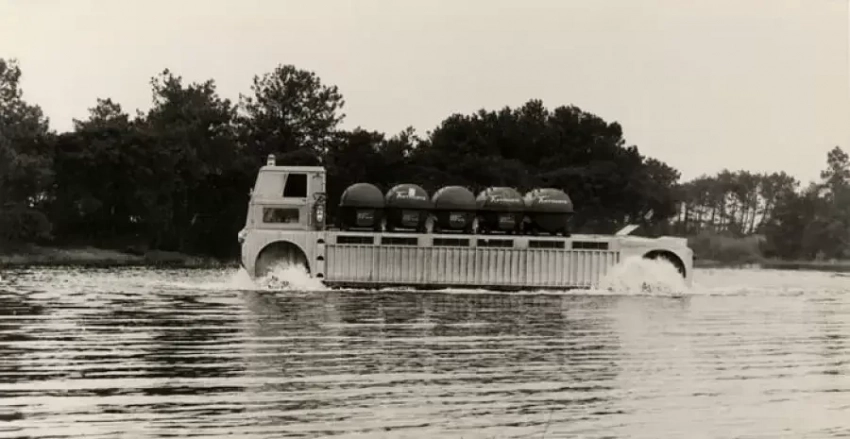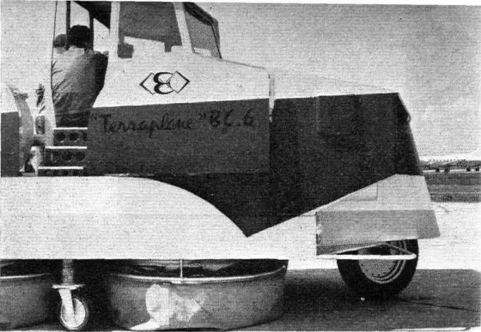 Именовалась она Terraplane BC6 (кто-то потеряли промежуточный индекс BC5) и неё отсутствовал турбореактивный двигатель. Взамен аппарат получил пару бензиновых оппозитных Porsche и один дизель Panhard. Это значительно повысило топливную экономичность BC6, а заодно и сопутствующий шум. Первые два отвечали за нагнетание воздуха под днище, дизель обеспечивал движение. Внешность у аппарата получилась своеобразная – что-то среднее между катером, тепловозов и баржей. Terraplane все также опирался на восьми гибких фартуков, но дополнительно получил по одному колесу спереди и сзади. Они должны были направлять транспортное средство по курсу и обеспечивать торможение конструкции полной массой в три тонны. Заднее колесо было ведущим, крутящий момент на него подавался от дизеля Panhard. Вместе с фирменной системой Бертане с отклоняемыми фартуками, это обеспечивало уверенную тягу. На стоянке при неработающем двигателе BC6 опирался на четыре колеса от гипертрофированной тележки из супермаркета. Кабина экипажа больше походила на рубку, но защищала от ветра и осадков. Аппарат появился на свет в 1963 году, мог ходить (или летать?) автономно до 200 км с грузом массой в 1400 кг. Очень неплохо, если учесть, что снаряженная масса BC6 составляла 1600 кг. На суше машина делала 70 км/ч, на воде – 25 км/ч.
