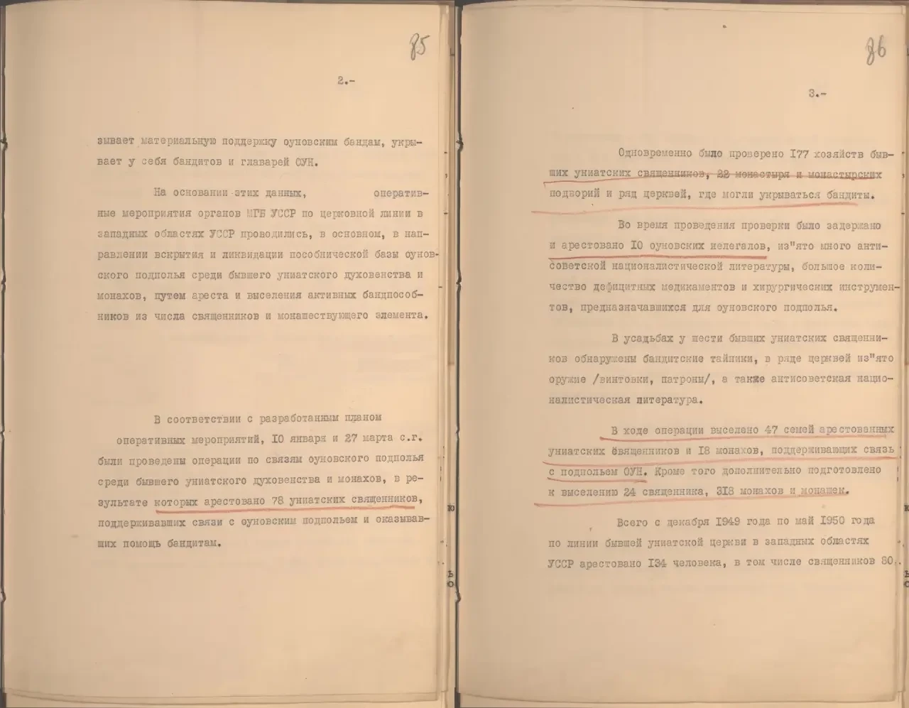 Одновременно было проверено 177 хозяйств бывших униатских священников, 22 монастыря и монастырских подворья и ряд церквей. В ходе этих проверок было арестовано 10 оуновцев (члены организации ОУН-УПА. — Автор), «изъято много антисоветской националистической литературы, большое количество дефицитных медикаментов и хирургических инструментов, предназначавшихся для оуновского подполья. В усадьбах у шести бывших униатских священников обнаружены бандитские тайники, в ряде церквей изъято оружие (винтовки, патроны), а также антисоветская националистическая литература», — сообщается в документе.