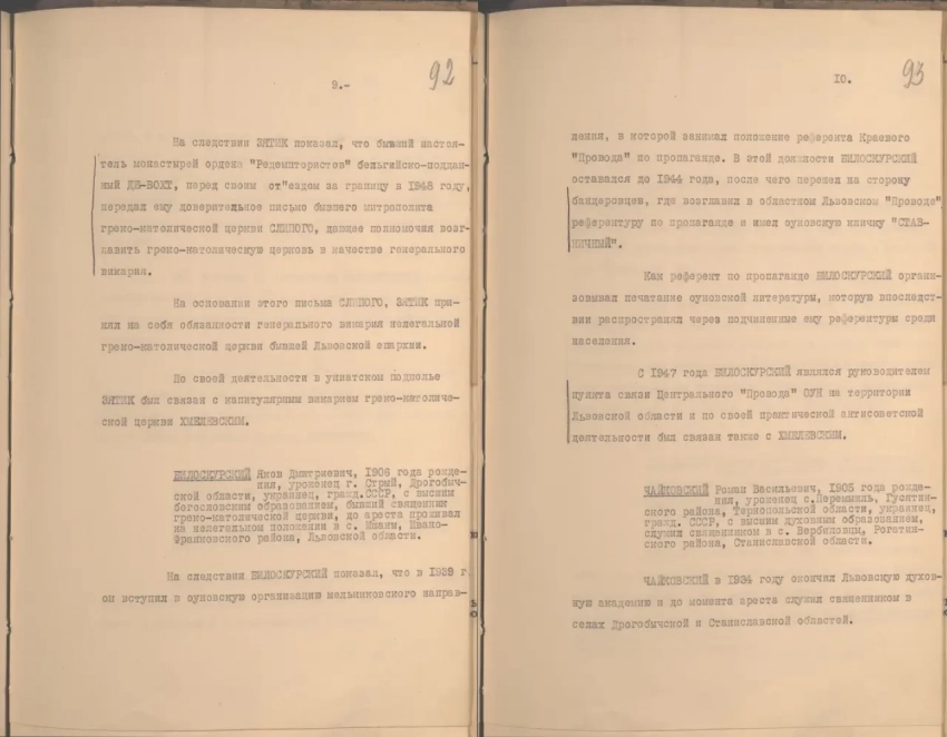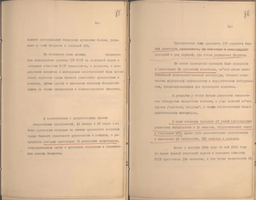 «В процессе оперативной работы по бывшему униатскому духовенству в западных областях Украины в МГБ (Министерство государственной безопасности. — Автор) УССР поступали данные, свидетельствовавшие о том, что значительная часть духовенства и монашествующего элемента бывшей греко-католической (униатской) церкви поддерживает связь с подпольем ОУН, оказывает материальную поддержку оуновским бандам, укрывает у себя бандитов и главарей ОУН».