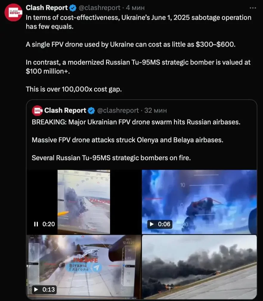 Да, это воскресение войдет в историю СВО и новейшей истории, потому что вполне может быть сопоставимо с входом СВУ в Курскую область. Репутационные потери огромные, потому что одно дело – клоуны, кривляющиеся на фоне какого-то административного здания с заявлениями на непонятном всему миру языке, и совсем другое – кадры атак дронов на легко узнаваемые Ту-95. Там никакие комментарии и не нужны, а учитывая, как эти ролики разошлись по Интернету – интерес к ним во всем мире огромный.