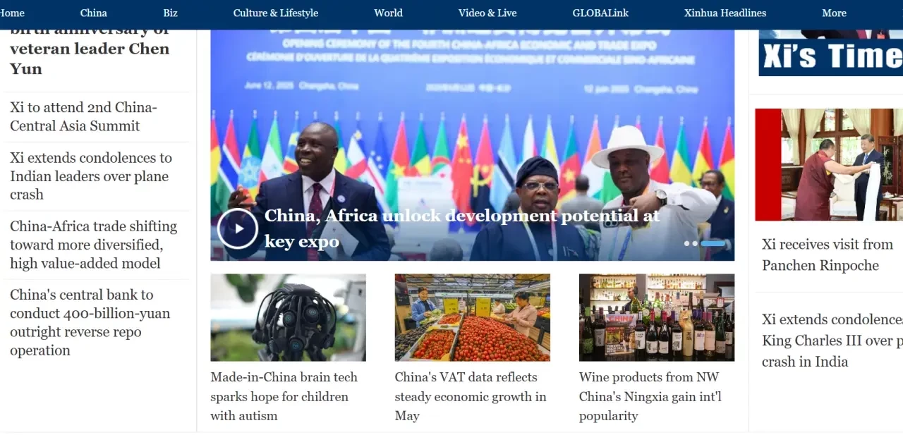 Ведущее китайское информационное агентство «Синьхуа» выходит с главной страницей, на которой есть информация о китайско-африканском экспо, о том, как всё хорошо в экономике КНР, о новом «Шёлковом пути», о поездке председателя Си и даже о продуктивном гнездовании цапель в провинции Юннань.