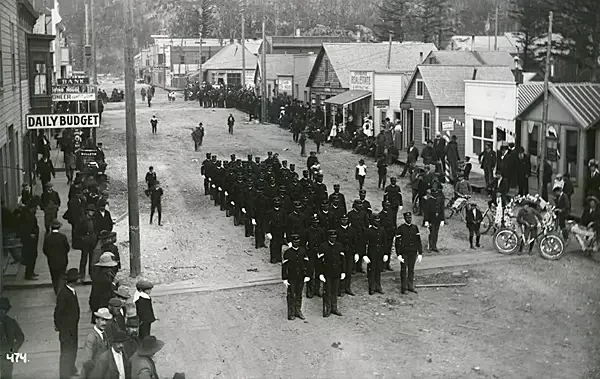 Во время золотой лихорадки на Клондайке на юго-востоке Аляски города Скагуэй и Дайя стали важными портами на пути к золотым приискам. Это были беззаконные общины, кишащие жаждущими золота искателями приключений. Один полицейский даже описал ранний Скагуэй как «немногим лучше ада на земле» и «почти самое суровое место в мире». Направленные на Аляску «Солдаты Буффало» помогали поддерживать закон и порядок в Скагуэе, а в октябре 1901 года они сыграли важную роль в предотвращении серьезного ущерба городу во время наводнения на реке Скагуэй. Эти отряды обеспечивали также военное сопровождение канадских чиновников, путешествующих от спорной границы с Британией до порта Скагуэй. Негритянские войска также оказывали постоянную поддержку в инцидентах между белыми поселенцами и индейцами-тлинкитами. На фото: рота 24-го пехотного полка выстроилась в строю на Пятой авеню 4 июля 1899 года в Скагуэе, Аляска. Источник: Elmer E. Rasmuson Library