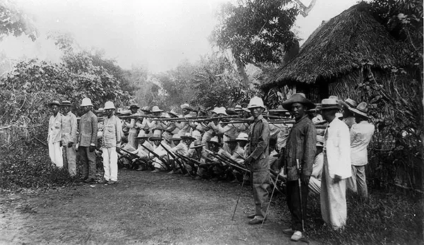 После поражения Испании в испано-американской войне Испания по Парижскому договору в декабре 1898 года передала контроль над Филиппинскими островами Соединенным Штатам, но после ратификации этого договора на островах начались боевые действия между войсками США и филиппинскими националистами (1899-1902). Изначально военное ведомство выражало опасения, что чернокожие солдаты могут отказаться от участия в этой войне, поскольку им придется сражаться с угнетенным меньшинством. Многие негритянские газеты и лидеры поддерживали независимость Филиппин и считали, что чернокожие солдаты будут использоваться в несправедливой расовой войне. Тем не менее, первая волна черных войск прибыла на Филиппины в середине июля 1899 года. «Солдаты-буффало» охраняли небольшие деревни и военные базы, чтобы поддерживать спокойствие в городах. В то время как большинство чернокожих солдат оставались верными своему долгу, около тридцати солдат дезертировали, а некоторые даже присоединились к филиппинским повстанцам, среди которых был рядовой Дэвид Фейген, бывший член Двадцать четвертого пехотного полка, ставший капитаном в филиппинской армии и доставляющий неприятности армии США до самой своей смерти. Источник: Библиотека Конгресса США.