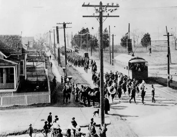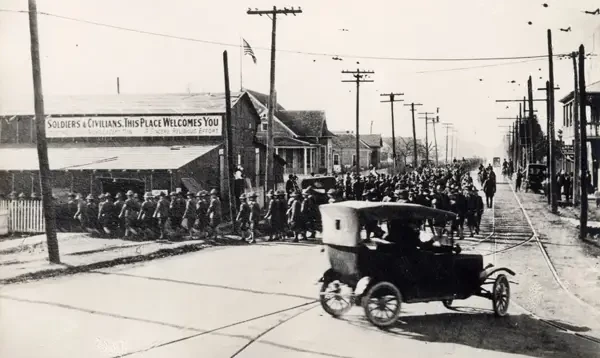 Длинная шеренга солдат марширует по улице недалеко от лагеря Логан в 1917 году. Источник: коллекция Хьюстонского университета