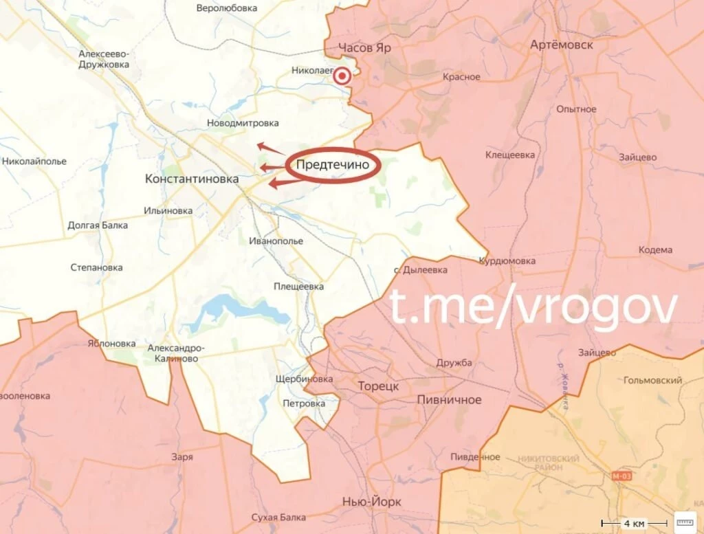 На Часовярском участке тяжёлые бои, но изменения всё же есть. В мкр Шевченко сохраняются очаги сопротивления, продолжается его зачистка. ВС РФ закрепляются севернее Николаевки, что позволяет держать под огневым контролем основные дороги из Константиновки в Часов Яр. МО РФ сообщило об освобождении с. Предтечино.