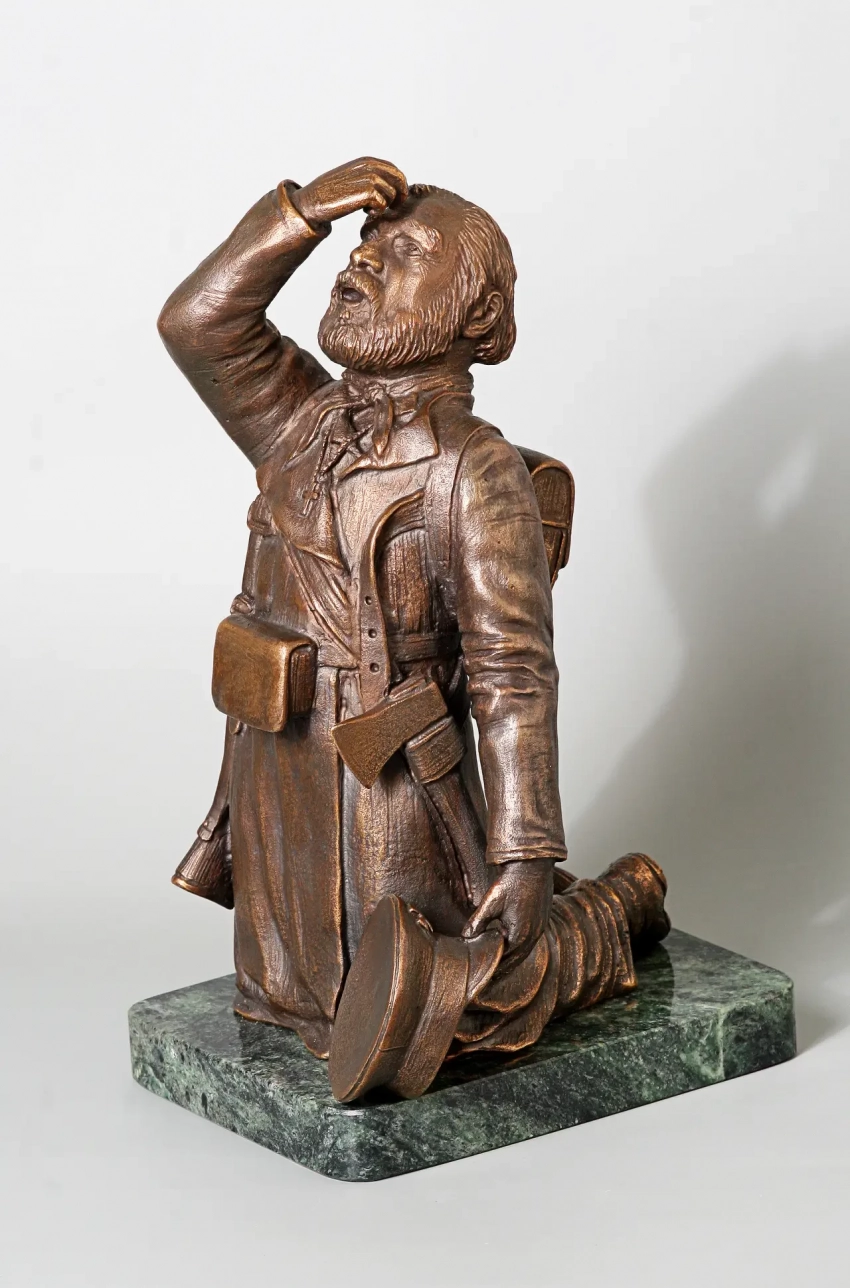 А вот это тоже фигурка ратника Пензенского ополчения, только отлита из бронзы, и это уже не «солдатик», а самая настоящая скульптура пензенского скульптора Германа Феоктистова. Называется «Молитва ополченца». Ну а то, что молились ополченцы постоянно и очень часто, известно очень хорошо. Крестьянам ведь с детства вбивали в головы, что «за царем служба, а за богом молитва не пропадают!»