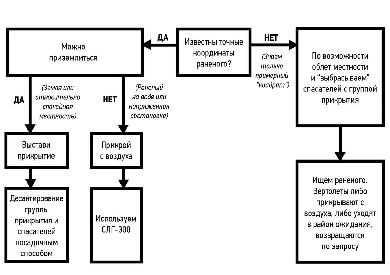 Сценарий 1. «Сели, забрали, улетели». Применяется при наличии возможности и относительной безопасности. Если есть точные координаты местонахождения раненого. Один «борт» приземлился и забрал раненого, другие – прикрывают сверху.