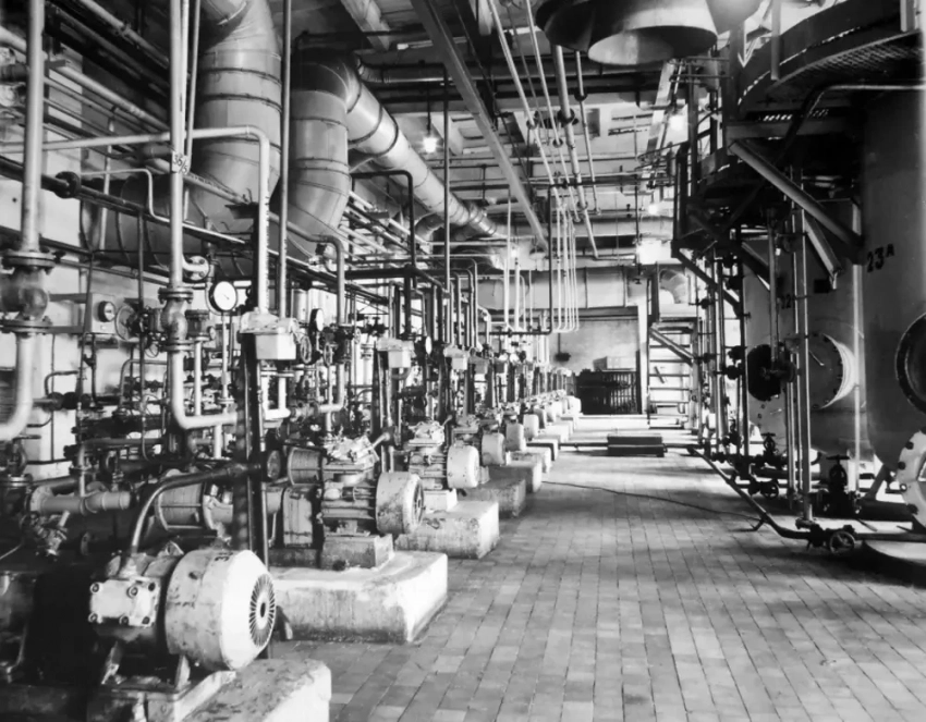 Главное — контроль температуры, который осуществлялся потенциометрами. Каждая реторта имела по три точки измерения температуры, данные с которых передавались на приборный щит со шкалами. Щит этот был сложным устройством: 2 км проводов, тысяча мелких отверстий и пять тысяч мелких винтов.