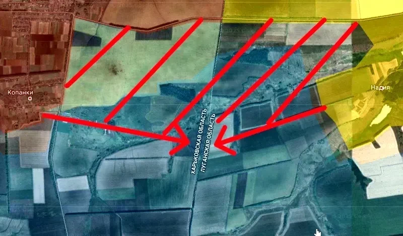 Российские источники сообщают, что ВСУ близки к потере всей оккупированной территории ЛНР. Происходит это в результате успешного наступления российской армии и продвижения наших войск на границе Харьковской области и Луганской республики. Причем продвигаются наши на нескольких участках, в том числе непосредственно из Харьковской области с северо-запада со стороны села Копанки.