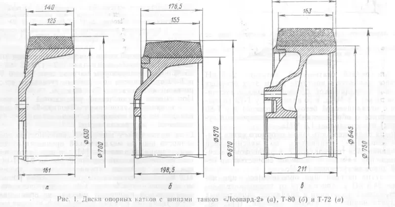 Одной из характерных особенностей опорных катков танка «Леопард-2», по сравнению с обрезиненными опорными катками отечественных танков Т-80 и Т-72, является применение резиновых шин меньшей высоты (в 1,4–1,5 раза) и ширины (в 1,2–1,3 раза) (рис. 1), что позволило уменьшить массу и габариты опорных катков. Так, масса диска с шиной для опорных катков танка «Леопард-2» составляет 46 кг, что на 20% меньше, чем у отечественных танков.