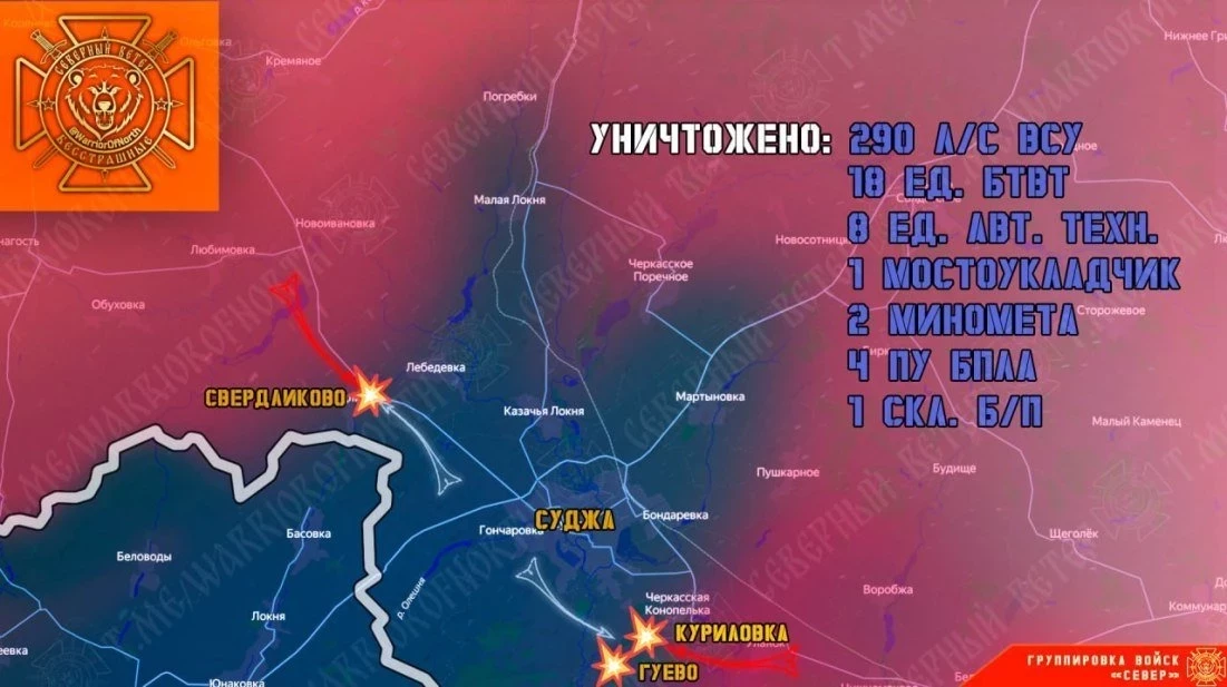 В окрестностях Гуево Северяне сломили упорное сопротивление противника и продвинулись на Юг, перерезая пути снабжения Суджанской группировке ВСУ.