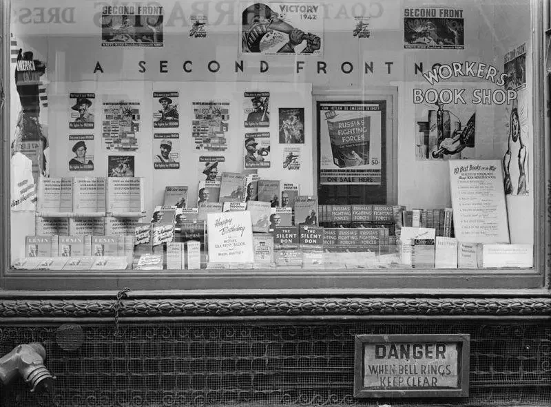 Коммунистическая лавка американской рабочей печати. Над изданиями надпись «Второй фронт сейчас!».