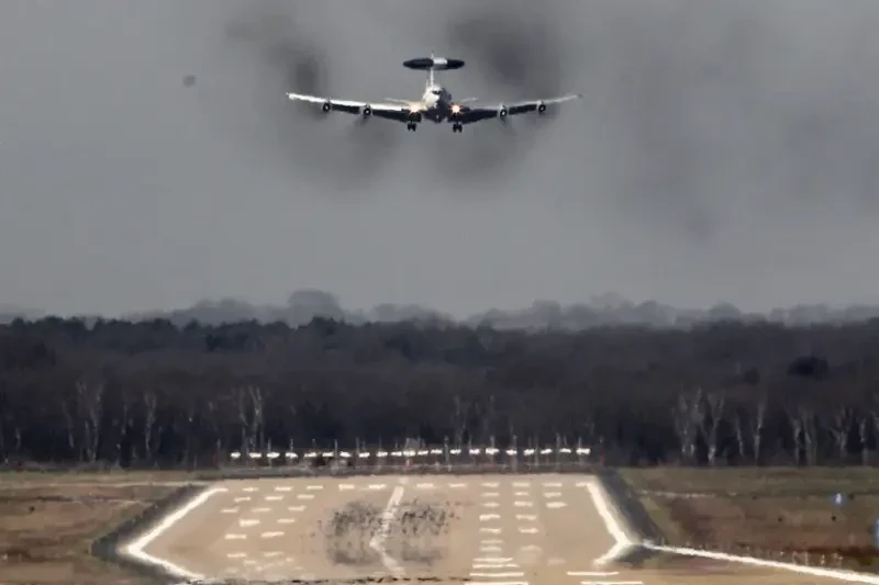 Самолёт системы дальнего радиолокационного обнаружения и управления (АВАКС) НАТО E-3A взлетает с авиабазы НАТО в Гайленкирхене, Германия.