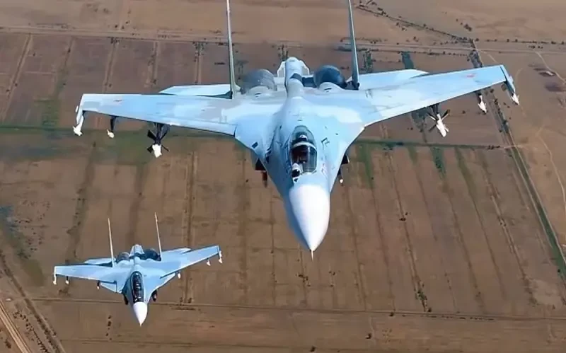 Российский истребитель Су-30СМ и британский истребитель «Тайфун» над Балтийским морем во время миссии по патрулированию воздушного пространства над Балтийским морем в мае 2019 года.