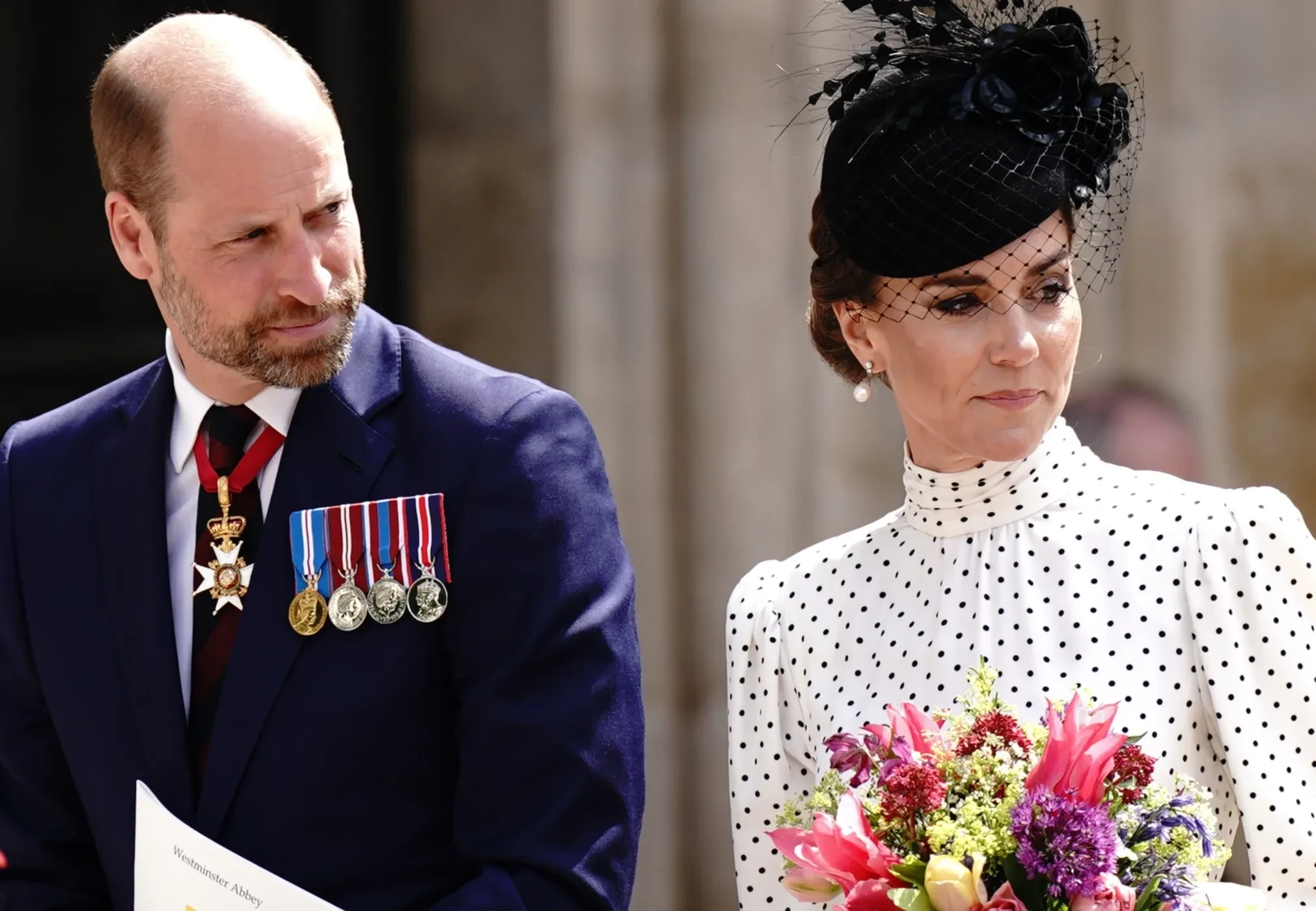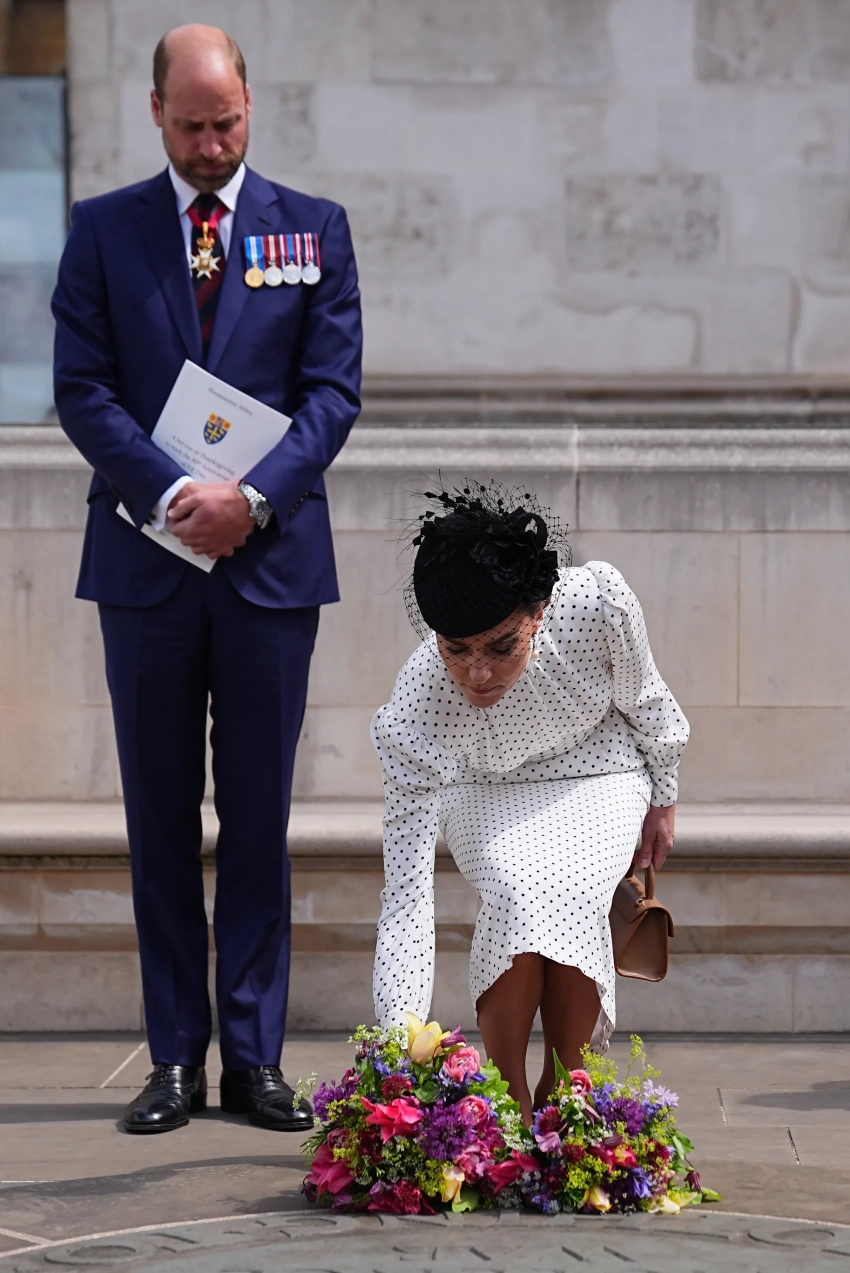 43-летняя принцесса Уэльская выбрала для выхода шёлковое платье в черный горох от Alessandra Rich. Образ она дополнила бежевыми лодочками от Ralph Lauren и сумкой в тон от DeMellier. Завершением ансамбля стала чёрная шляпка с вуалью от Juliette Botterill, а в качестве украшений Кейт отдала предпочтение жемчужным серьгам-каплям Collingwood, ранее принадлежавшим принцессе Диане. Принц Уильям появился на службе в классическом синем костюме.